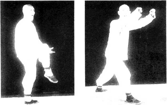 1. 接右蹬脚。蹬脚收回,屈膝悬于腹下,脚尖下垂, 两手由外向内圆转,合于胸前,以左脚跟为轴,向右转 45。,向东南仍直立,两臂弧形下垂于右脚两旁,手心向 上,指尖向前。眼向前平视(图139)。