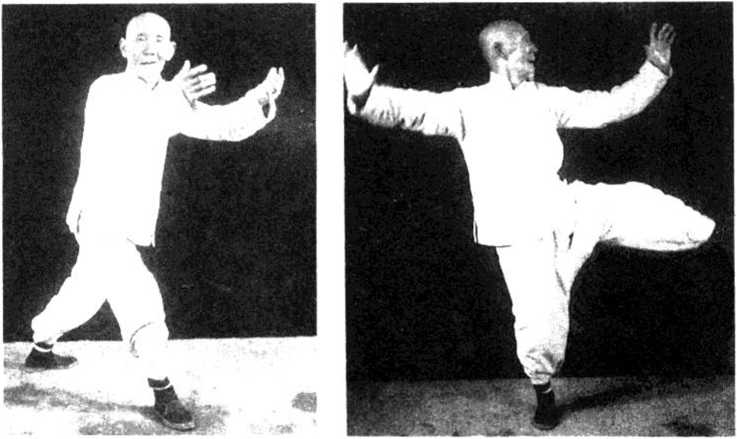 式中两手作开劲向外圆转分开,身躯向后移,重心 移于左腿。这3个动作要同时进行,两手由下经上圆转 合于胸前时的动作,形似捧月。