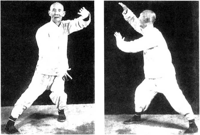 又如对方以右拳进攻头部或胸部,则用右手探之, 并进左步,转至对方身后,以左臂击其胸,并将腰往左 转,对方必向左侧跌出。左右前后4个角均如此。