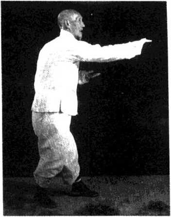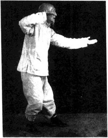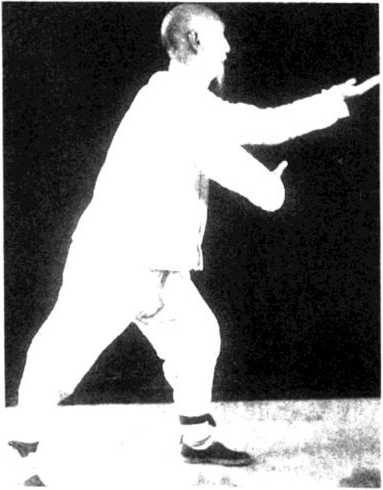 2. 腰胯略左转,右腿稍直立。同时右手随腰向前探 出,掌心向下,指尖向前,面向正东;左手随腰向下往 后收至左肋卜「,掌心向上,指尖向前指伸。眼随右掌探 出前方平视(图187)。