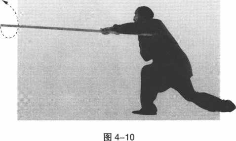 两手持棍向左、向右、再向左转打;两腿自然下沉,身随腿下 沉的同时,左转45。,面向西南;眼看棍前端。(图4-10)