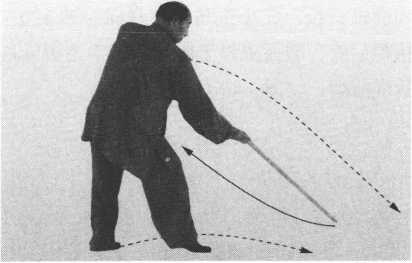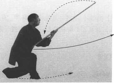 ② 左脚向前进一步,脚尖着地,成左虚步;同时,右手捋棍后 收,左手持棍向前右方斜扫,棍头朝下;眼看棍前端。(图4-15)