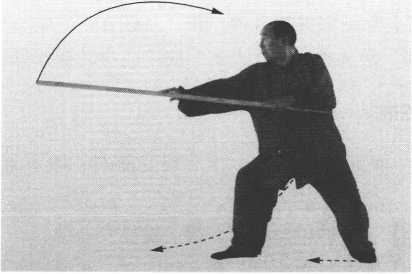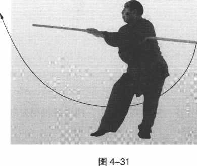步不动;两手转棍挑打,棍后端变前端;眼看棍前端。(图 4-32)