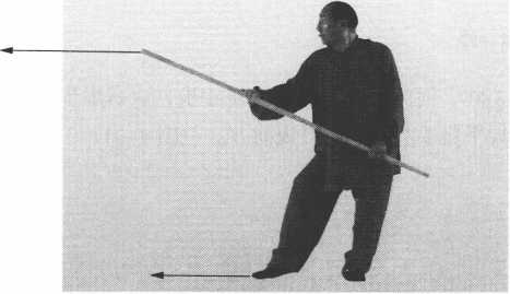 右脚向前进寸步,成右自然弓步;两手持棍用力向前直戳;眼 看棍头。(图4-33)