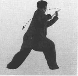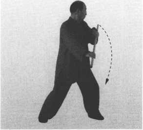 ⑥ 身略右转;两手持棍向右侧扣打,棍斜停于右侧;眼看棍前 端。(图3-146、图3-146附图)