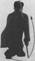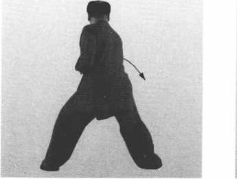 ⑦ 身略右转,右脚向左侧后退一■步,两腿屈膝全蹲,成歇步; 同时,两手向右后转棍,垂棍靠于右肩后,左掌脱把屈臂停靠于胸 口前;目视前方。(图3-147、图3-147附图)
