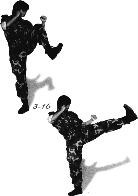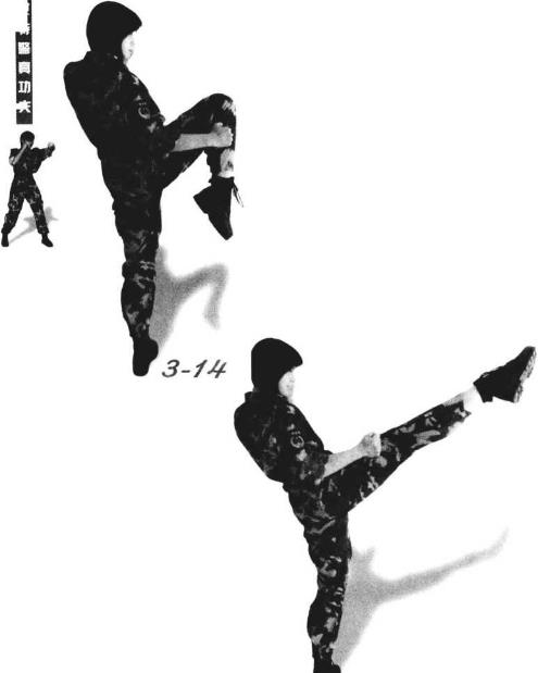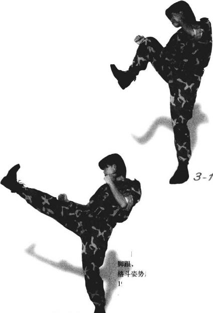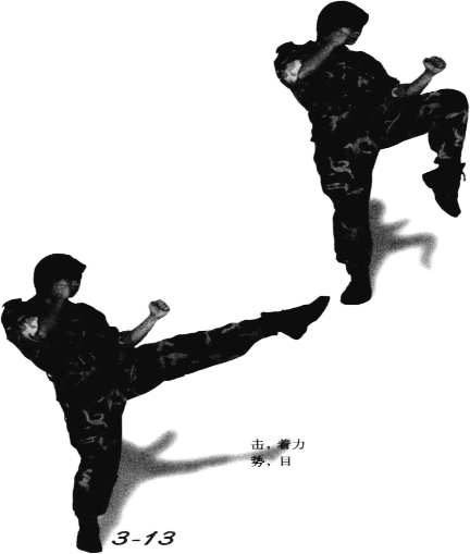 在格斗姿势的基础上右脚前垫步重心移至右脚右腿支撑微屈左腿提膝上抬脚尖绷直(图3-12)大腿带动小腿向前上方纵向弹点在脚背上体保持格斗姿视攻击方向(图3-13),击出后迅速将腿收回成格斗姿势。