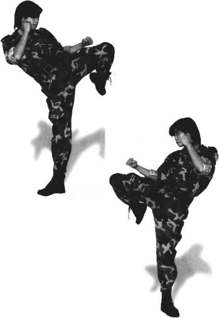 抬左腿屈膝翻胯由侧面横撞敌肋部着力点在膝盖上方(图3-32)。