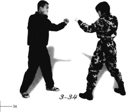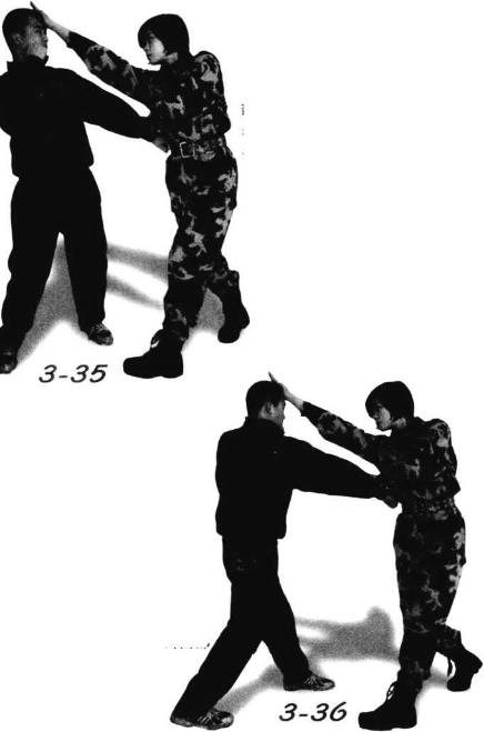 对手用左直拳直击我面部或胸部我左手由左向右下拍击敌左拳进行防守的同时右手以掌推击对手面部(图3—35)。