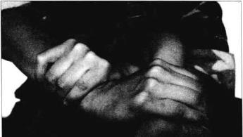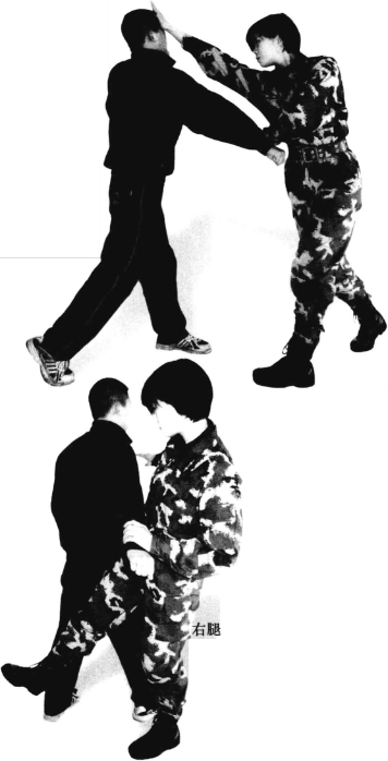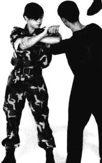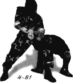 4我将敌左肘部贴至我胸前后,双手合力向下别压敌左小臂将敌控制(图4-81),近图演示控制手法(图4-82)