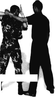 2 我右手抓敌左手腕的同时滑步至敌身前左手以小臂下砍敌右肘窝使敌肘部弯曲(图4—79)。