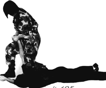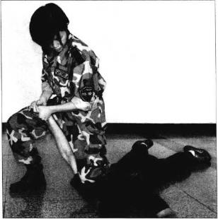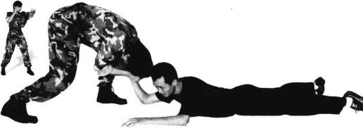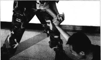 敌向前爬卧倒地(图4-193)。敌有疼痛松手后我双手大拇指和四指的合力折敌手腕和分指将敌折腕分指控制(图4-194)。3我左脚向敌右侧上步以左膝跪压敌右肩双手向上提拉敌右臂将敌控制(图4-195),近图演示跪肩分指控制运作(图4-196)。动作要点双手上提扣手要快、准、紧折腕下蹲要同步折腕跪肩不松懈。