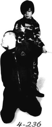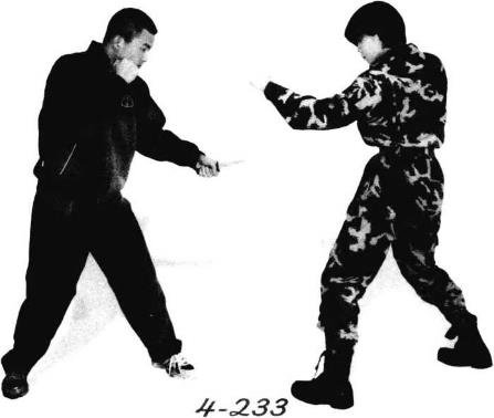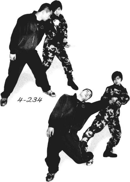 开始姿势我与敌在格斗姿势或站立的基础上敌在正前方上步左手反持匕首向我喉(胸)直刺(图4—233)。制敌动作1我右脚上步左闪身的同时右臂由内向外格挡挟敌左大臂左手虎口向前抓敌左小臂(图4—234)。4-2352我右腿上抬用右脚下踹敌左腿膝窝同时双手拉紧敌右小臂(图4-235)4-2374-2374-2374-237