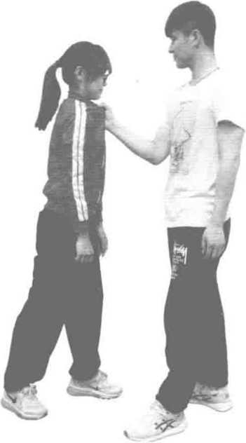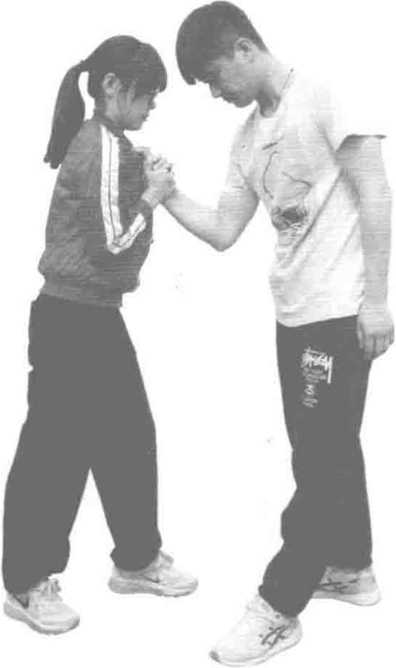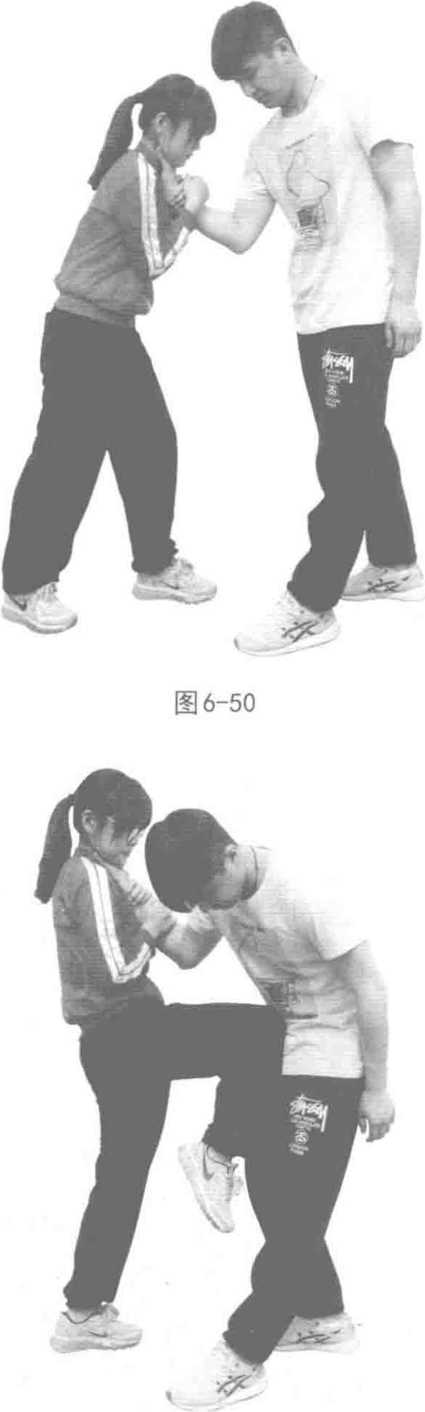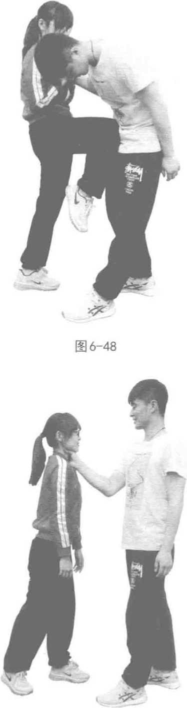 图6-46图6-46(1)歹徒屈臂抓女方胸部拉女方欲往怀里带(图6-46)。(2)女方顺势顺手扣住歹徒手掌用力下压卷其腕(图6-47)。(3)接着女方借力提膝狠顶歹徒裆部致其疼痛迅速逃离(图6-48)。12 切腕顶裆(单手屈臂掐喉)(1)歹徒单手屈臂掐女方喉部欲逼女方就范(图6-49)。(2)女方双手用力扣歹徒手掌并向下猛力狠切其腕部(图6-50)。(3)接着女方顺势提膝狠顶歹徒裆部致其疼痛迅速逃离06-51)