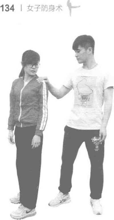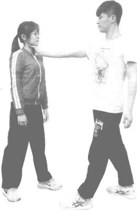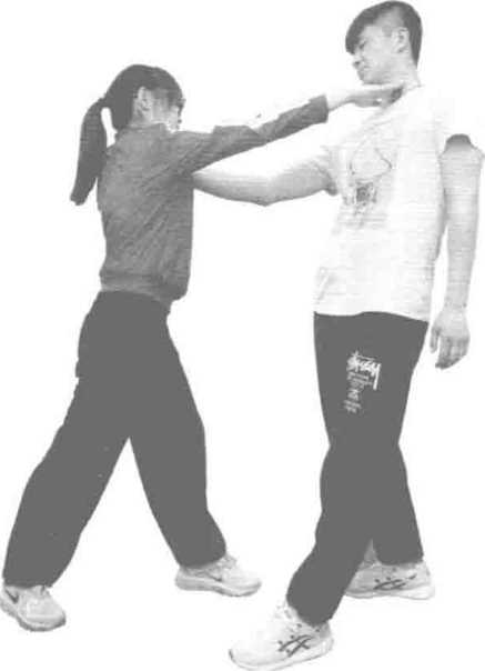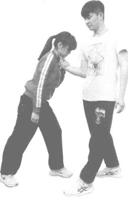 图6_54图6_54(3)女方转肩刺掌向前插掌尖直击歹徒咽喉致其疼痛迅速逃离(图6-54)