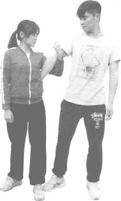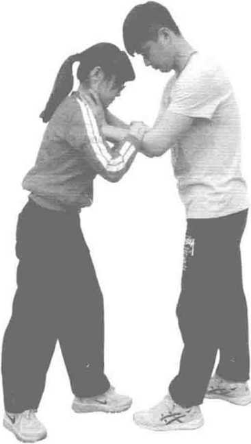 图6-52图6-52(2)女方顺手内扣猛切歹徒肘部使其臂弯曲手松力(图6-53)