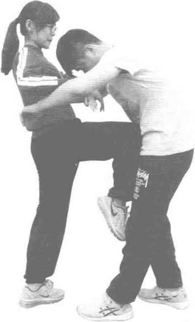 图6-56图6-56(3)女方借力提膝狠顶歹徒裆部致其疼痛迅速逃离(图6-57)。