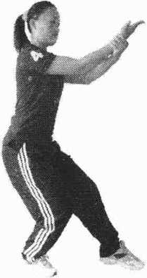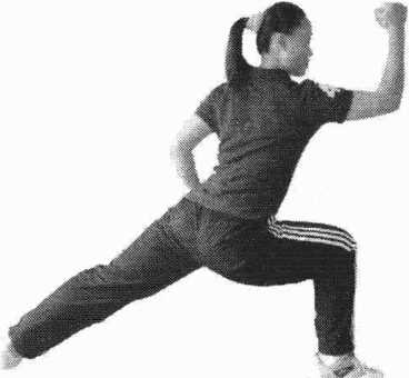 动作要领右腿上前半步成右弓步右手握拳向前上方勾挑拳心向内同时左拳回收腰间眼视前方(图129)。