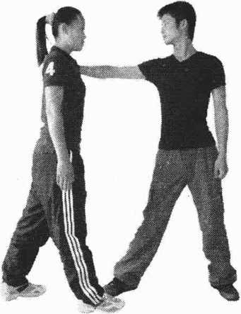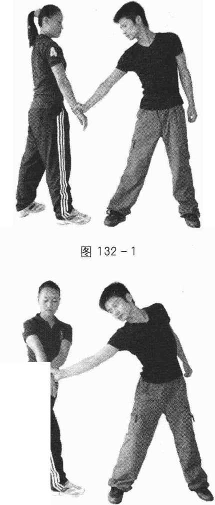 用法如歹徒左手抓我胸部时我可用左手扣住其右手手背微向左转腰同时使用右勾拳向上击打歹徒下颗部位(图130-1图130-2)。