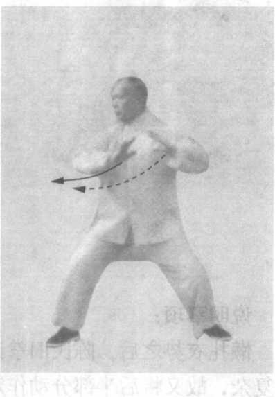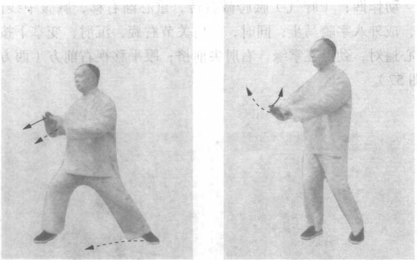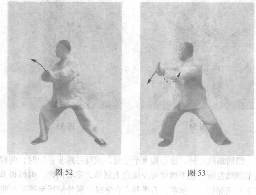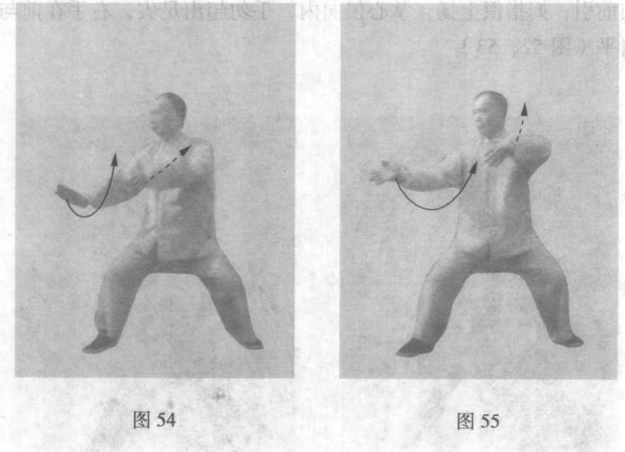 动作二:(呼气)腰胯微右转;同时,右手微内旋,使掌心 翻向左前下;左手微外旋,使掌心翻向内上;随即腰胯微左旋, 重心稍后移,左前臂含搠劲向左平移划弧,右手劲点在掌缘和尺 骨处,向左微向下捋回(似推手时对方双手按我左前臂,我左手 用搠劲走化引进,右手用捋劲使对方来力落空)(图54)。