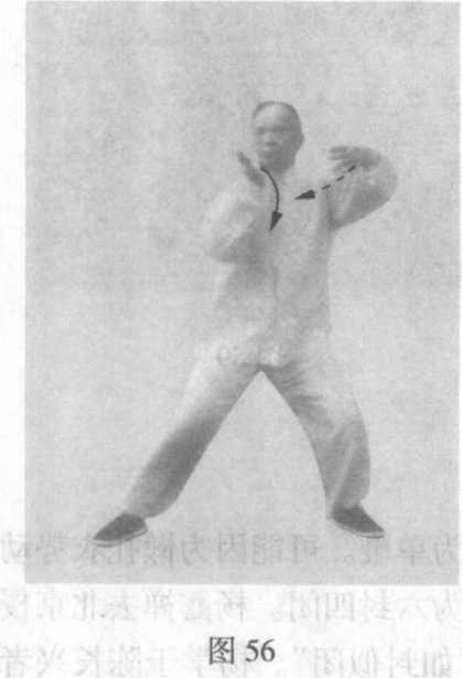 侧,掌心向左上,掌根距颔约四个横拳,沉肘,肘尖距下肋约二 横拳,胸腹中线向南微偏左;眼移视南方,耳听身后,身法中 正,落胯塌腰。此式为陈式推手中常用的边搠、边捋、边采(反 关节拿法)之法(图56 )。