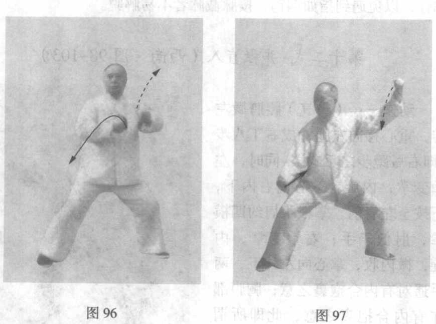 动作二:(呼气)两胯骨节前送,重心移右腿成弓蹬步,裆 劲下沉(此动作可在原地,也可右足先上半脚,左足跟上半脚); 同时,劲点在两拳背中指、食指根节处,两拳外旋,右拳向右下 沉,拳心向上,停于右膝上,相距约一个半横拳;左拳往左后上 击,屈肘,拳心向左耳侧;眼神关顾右拳;肩松沉,肘沉住,两 拳到落点时,同时一震,内劲猝发之意,亦即内劲到此贯足;顶 劲、沉气,含胸拔背,落胯塌腰,裆部开圆,膝节有力,两足之 劲,如深入地中,脊柱节节松沉,带脉、冲脉之气,似乎运至四 梢(两足、两手尖端)(图97)。