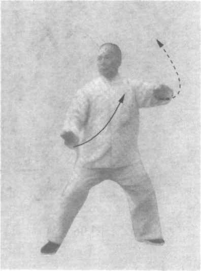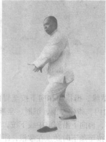 动作一:(吸气)腰胯微左 转,重心移向左腿,成右丁八步 (即右弓蹬步之反式);同时,左 拳变掌,内旋,掌心向右内下, 下按至左肩前,掌根距肩约四横 拳,肘低于手;右拳变掌,内 旋,微内收,掌心向左外下,两 手遥对有内合抱裹之意;胸腹部 亦有内合抱裹之意,此即所谓 “合为虚、为蓄、为吸”;两膝亦 有内扣之意(图98)。