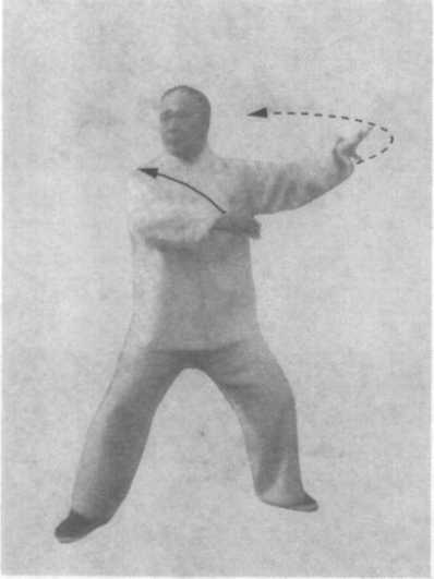 腰胯微左转;左手微内旋,掌心向下,劲点在掌缘,向左侧 划弧捋去;同时,右手向左上划弧捋去,劲点在掌缘至左乳前, 拇指尖距乳约三横拳,沉肘、坐腕;眼平视身前,眼神关顾两手 移动(图99 )o