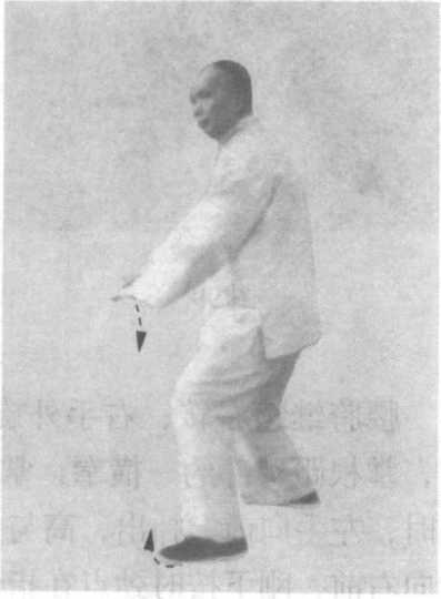 南方)踏下,两足距离与肩 同宽,重心在左足;同时, 两手继续下按,右手在小腹 前,掌心向内,掌根距小腹 约一横拳;左手下按至左胯 前,掌根沉住劲,距胯约一 个半横拳;眼视左前(图 102 )0