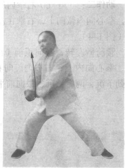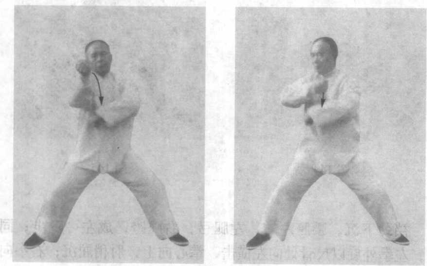 2 .此式主攻方向为左拳横击发劲,同时左胯一旋,右肩一 转,右拳下击,同时发劲。发劲能健强内脏。每天单练此式数十 下,能提高爆发力的质量。