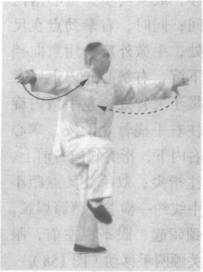 动作一:(吸气)左足尖里扣,对向右前45。,左腿屈膝站 稳,两胯根右旋内收,腰右转;右膝上提与脐平,或高过于脐; 同时,右手微外旋,微向左划弧至胸窝前抓成拳,拳心向内;左 手弧形上提合于胸窝前,掌心向下,与在下之右前臂交叉而过, 再右拳内旋向右侧伸展,左掌内旋,劲点在掌缘向左侧捌去,两 手到落点时用意贯劲,左掌心横向左前下方,右拳心向下,两手 与肩平,两肘微屈;眼视左前(图155)。