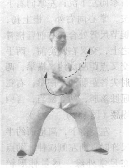 腿,然后两胯根住左送,腰 左移,成骑马步,重心落两 足间;同时,右拳劲点在尺 骨处,手微外旋,用意向裆 中下沉,右拳心向内上,意 劲贯于尺骨处;左手微内旋 贴住右手梗骨处下按,掌心 向右内下,指尖斜向右前上, 意注指尖;双手交叉点距小 腹中线约一横拳,落胯塌腰, 顶颈领起;眼平视左前,眼 神关顾两手移动(图158 )。