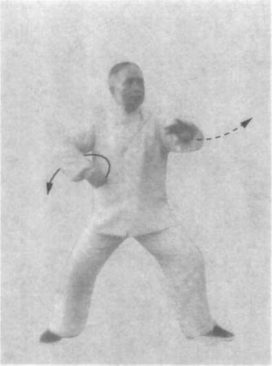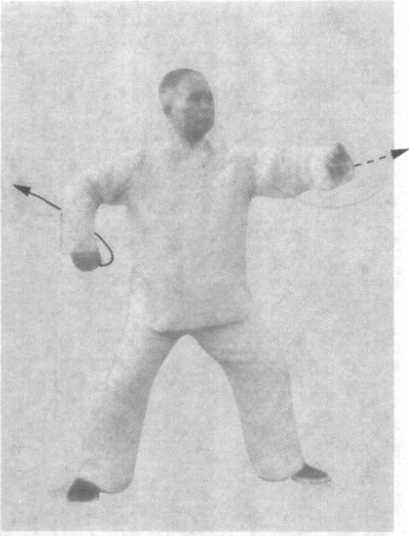 右拳继续向右展开,拳眼距腰侧约二横拳;左手继续向左外 展开,掌心向左前(东),劲点在掌缘(图160)。