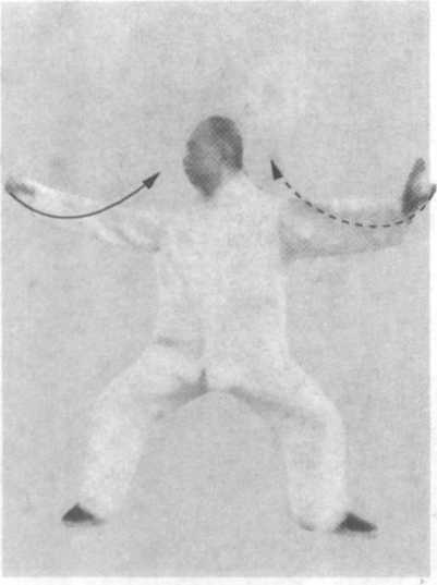 内,相距约一立拳;左手内旋向上划弧至胸锁骨中线前,掌心向 下,再内旋向左展开至左肩前,掌心向外前,掌根距肩约六横拳 (图 159 )o