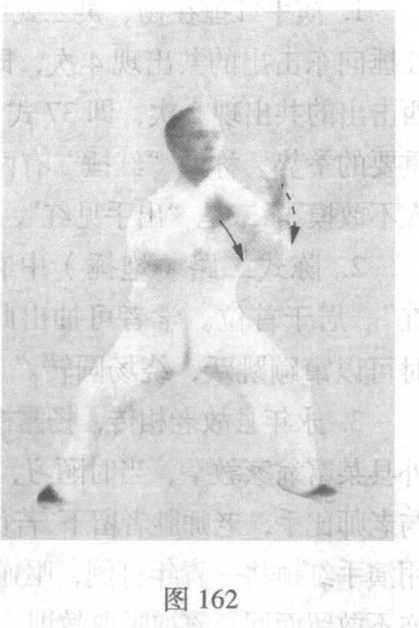 两肘下沉内收,肘尖距两下肋前侧各约一横拳,两手再经面 前外旋下沉,合拢于胸窝前,左掌心向内上,指尖向右前上,劲 点在掌缘;右拳在内在上,与左掌相距约一横拳,拳心斜向内左 上,劲点在尺骨处;眼视左前,合为吸、为蓄(图162)。