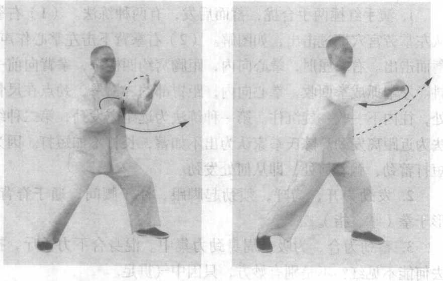 1 .右手在胸前中线将来手(不论左手或右手)抓住(或用 掌缘捋)往右划弧抖出(腰要右转),左手向对方手臂或胸部用 急劲捋拍,动作弧形螺旋,曲中求直,向左右鞭开,着人身手如 刀砍削,震动力要强大,方能出手惊人。同时起右膝顶撞对方身 前痛处。