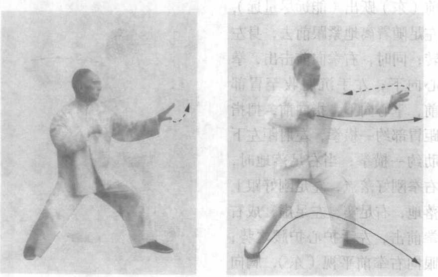 动作二:(呼气)腰胯右转前送,重心前移,成前七后三的 弓蹬步;同时,左掌内旋,指前伸,掌心向左,肘微屈不直,意 注指尖;右肘往后挤出,拳眼距右乳约一横拳,一前伸,一后 挤,成对拉发劲;胸腹中线对向右前约90。(南方);眼视前方 (东方)(图166 )o