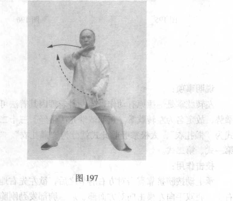 动作一:(吸气)腰胯右转,重心右移,成骑马步,身向 南;同时,右手内旋,劲点在掌缘,微向右上划弧,至下颔前中 线,掌心向下,掌根距下颔约四横拳;左手外旋,向右、向下划 弧至脐前,掌根距脐约二横拳,劲点在掌根,掌心横向右前,指 尖向左前,沉肩垂肘;眼平视前方(图197)。