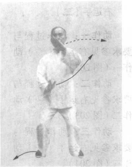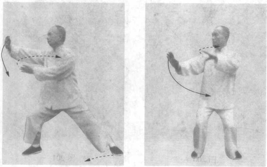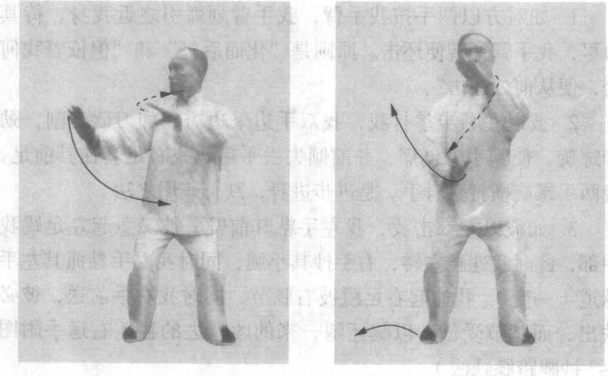 3 .左手管左半身,右手管右半身,两手运转各自不超过身 前中线。左手向右去,右手向左去,全凭转腰移动身前中线,使 两手不越过中线。
