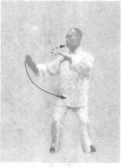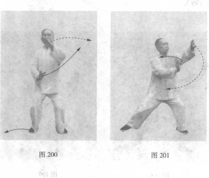 动作四:(呼气)腰胯微左转,重心落两足;同时,左手内 旋,向左微向上捌去,至左下颔前,掌心向左前下,反掌,小指 在上;右手外旋,向左横掌按至脐前偏右,掌根距脐约一个半横 拳,掌心横向左,指尖向右前,沉肩垂肘,落胯塌腰;眼平视前 方,耳听身后(图200)。