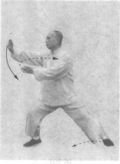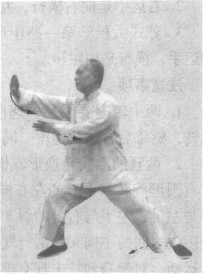 2 .彼以左顺步拳打我,我双手边采边捋,如刀砍斧削,劲 带螺旋,使其手臂创痛,并前倾失去平衡,我右足套住其前足, 我两手螺旋横打其身手。是进步进身,跌打兼用之法。