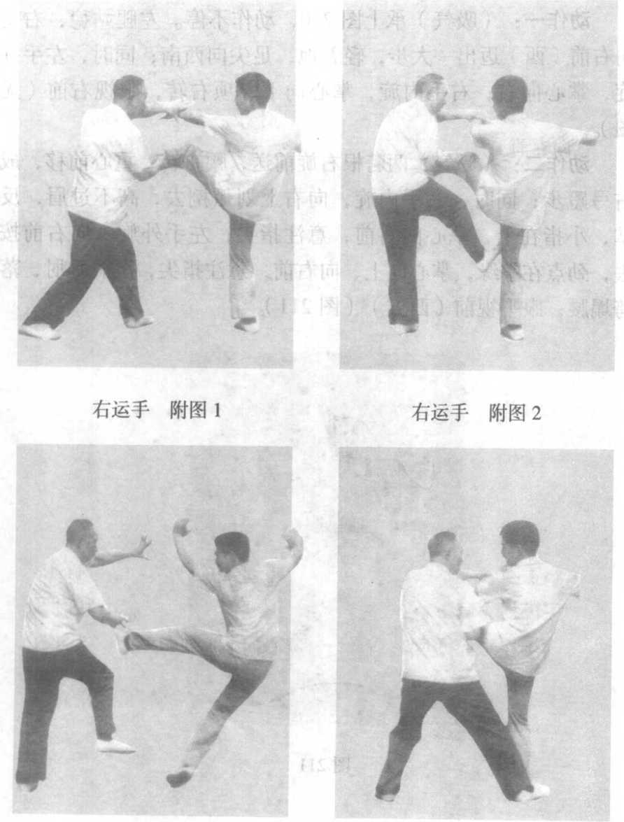 右足套住彼右足跟,我右膝前挺, 跌于我身前(右运手附图4 )。