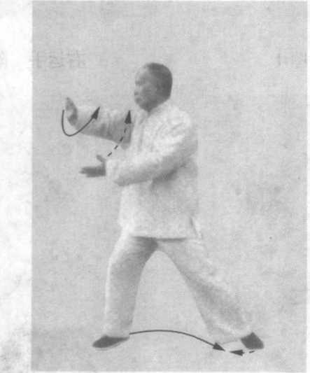 动作四:(呼)左腿站稳,腰胯继续右转,身向北,右足跟 贯劲向右后上方勾挑,膝高于脐,膝尖距右乳下约三横拳,右足 尖自然下垂;同时,右手内旋,掌心翻向下,从胸前中线划弧捋 回,再内旋向右后捌去,肘尖后挤与肩平,右手反掌,小指在 上,食指在下,距右乳约四横拳;当右手在胸前捋回时,左手内 旋,掌心向下,从右手上交叉而过,边捋边按,向左前(西)横 掌按出,小指在上,掌心向左前,高与胸窝平;顶劲、沉气;眼