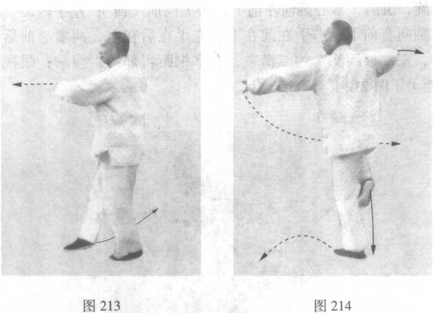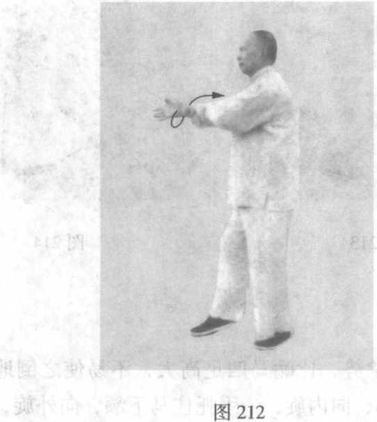 动作三:(吸气)左足尖内扣,足尖向西南,腰胯右转,重 心移左腿;右足尖点地后移,成丁字步,身向正西;同时,右手 外旋,沉肘,掌心翻向左前上,指尖向前(西);左手内旋,掌 心翻向右前下;右手在前在下,左手在后在上,两掌心前后遥 对,左掌根距胸窝约二横拳,右掌根距胃部约六横拳;眼视前 (西)(图 212)。