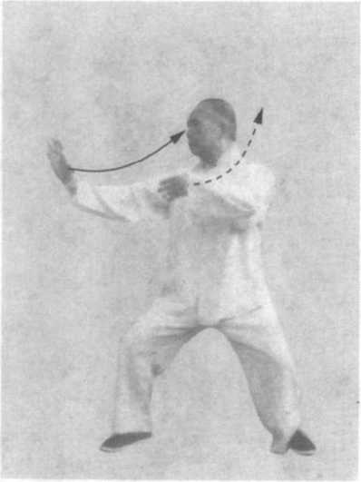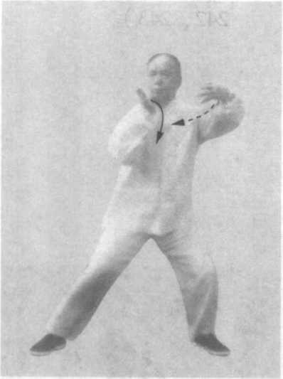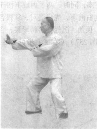 右手微外旋向左外捋,劲点在掌缘,掌心转向南,指上扬, 沉肘;左手劲点在掌背,微左上搠旋;腰胯微左旋,眼稍向左平 移前视(图235 )o