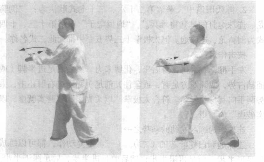 掌、小指侧在上,掌心横向 左前,手足方向。致;右手劲 点在拇指与小指,往右后采 捋,肘尖向右后挤击,右手 掌根距右侧前肋约一个半横 拳;顶劲、沉气;眼向左前 平视(图253 )0
