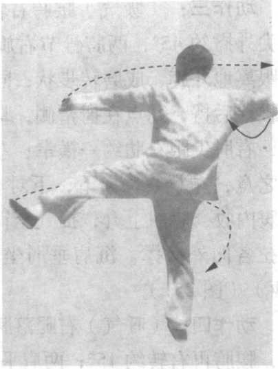 3 .图253拳势之后,另有一练法。右转身180。,身向东, 左脚向上、向右经面前以足底横扫,至正东面前,右手外旋自右 上向左以掌迎拍左脚底,声响干脆,叫做挂面脚。然后成图254 拳势,右转身左足高举跨下,故叫做“倒骑龙”。