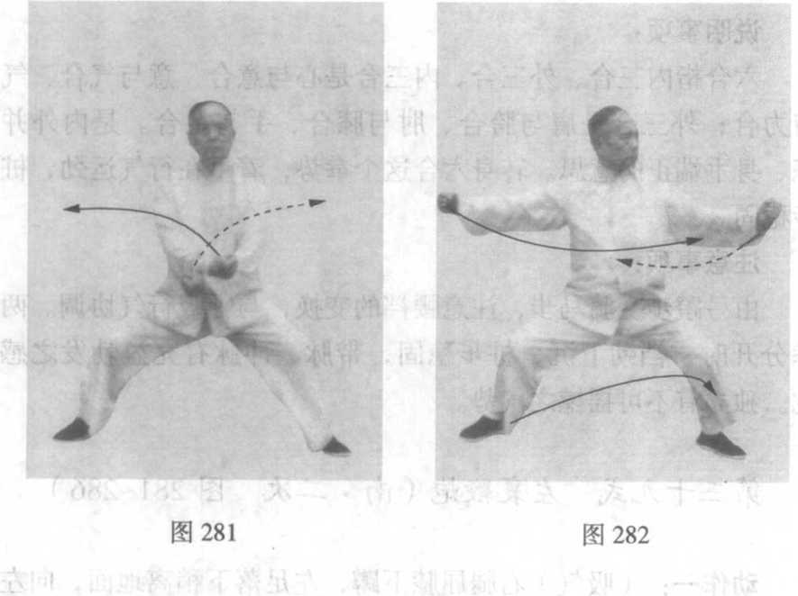 两胯根左旋向左前送,重心向左移,成骑马步;两拳内旋向 内合拢交叉于脐前,但左拳改为在下在外;眼平移视正前方 (南),是为合、为蓄、为吸(图281)。