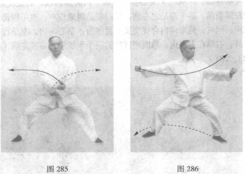 拳即向左微展,右肘和右拳同时向右微展,沉肘,两拳拳面相 对,相距一横拳,两拳拳眼向上,拳距脐上两侧各约一横拳;眼 平移左视,眼神关顾左拳外展(无图)。