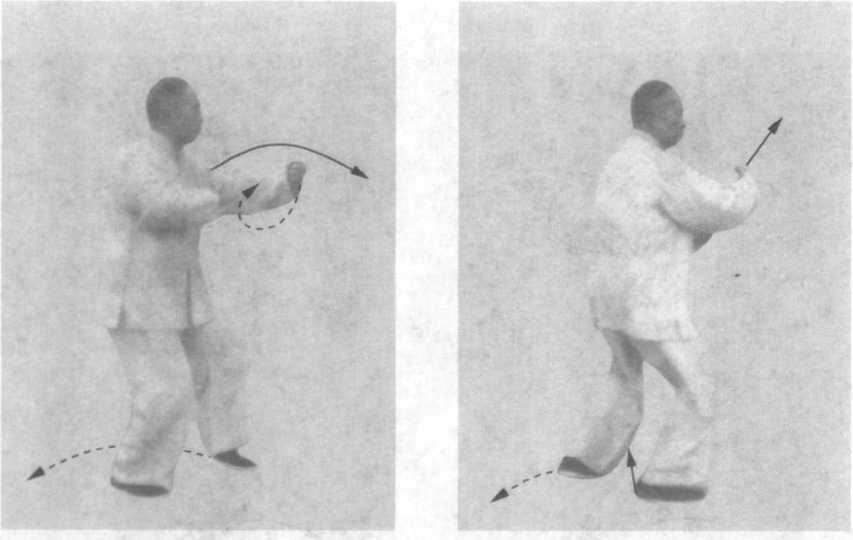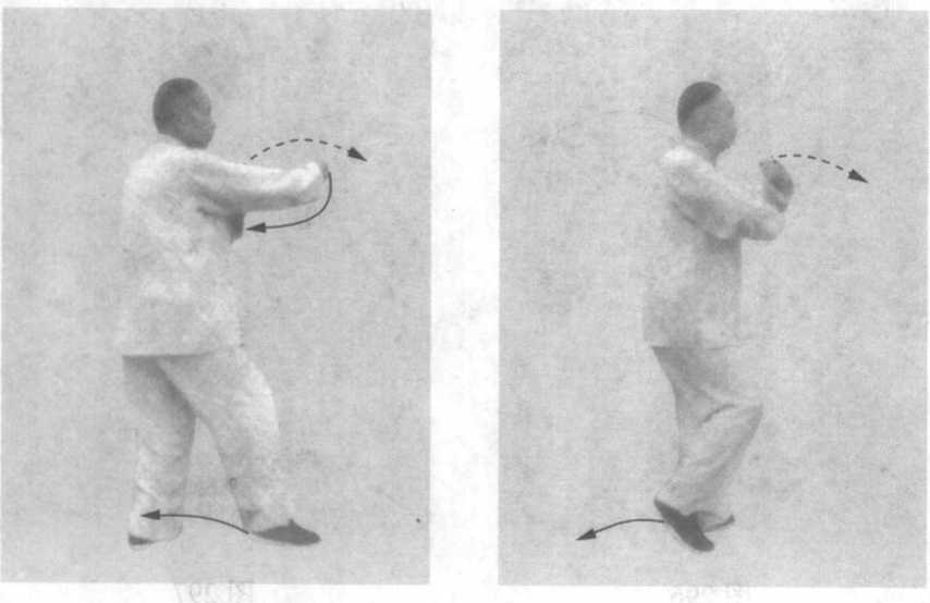 动作四:(呼气)腰胯继续左转,左足继续后退半步,踏实, 重心移于左腿;右足跟提起,右足尖轻点地,胸腹中线对向东北 (左前45。);同时,左拳继续内收,拳心向内,距胸窝约一横拳; 右拳继续前搠,拳心向内,与锁骨相距约五横拳,意注拳背;顶 劲、沉气,含胸拔背,落胯塌腰;眼平视正前方(图298 )。